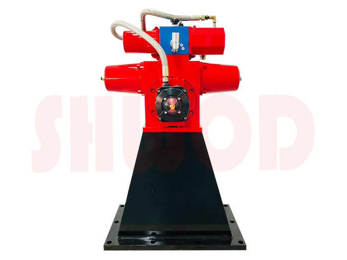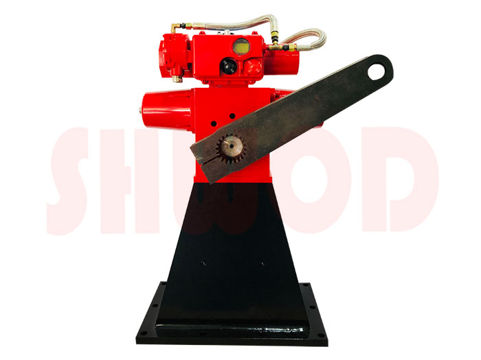 FDM係列智能型電液執行器由支架,雙作用齒輪齒條執行器、液壓動力源和電氣控製係統組成。 其中液壓動力源包含電機泵組以及手動泵。