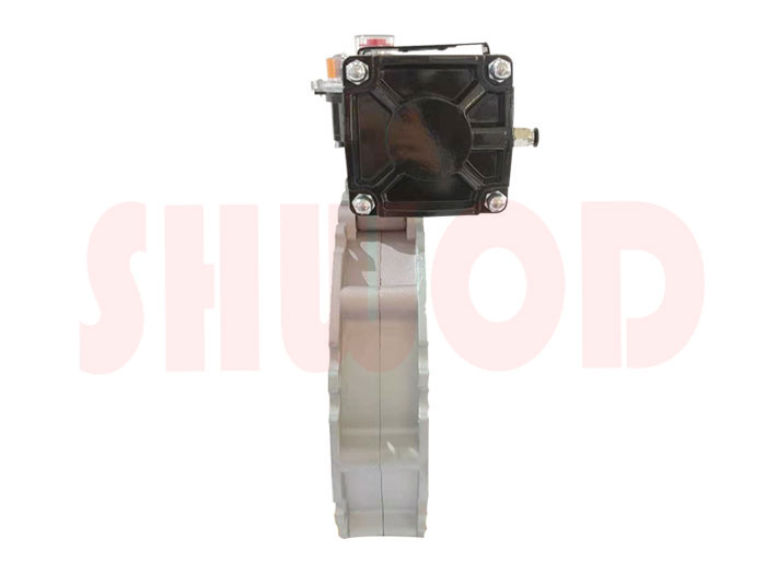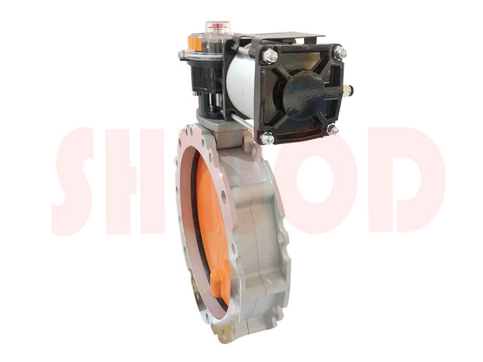 雙法蘭氣動粉塵蝶閥閥板中間為平板結構,閥杆設置在閥板的上下兩側並與閥板一體連接,密封座套接在閥板上,閥板兩側的閥杆穿過密封座的軸孔容置在閥體的軸孔內。氣動粉塵蝶閥由粉體板、丁晴密封圈,覆以耐磨高分子材料加工而成,半閥體為鋁合金材料,旋轉閥板采用高分子材料製作,專用於粉狀及顆粒狀物料處理。